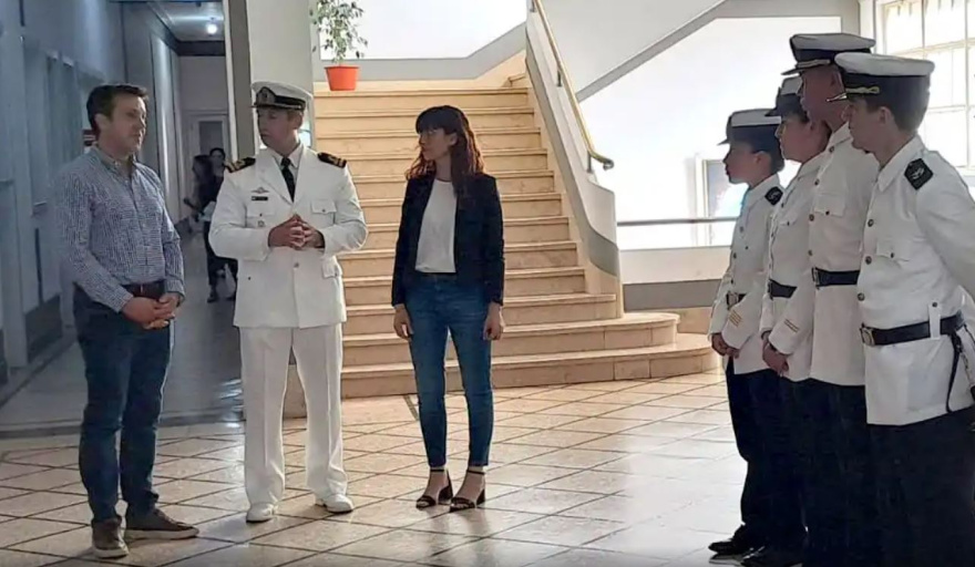 El intendente Arturo Rojas, acompañado por la secretaria de Gobierno, Paula Faramiñán, recibió en el municipio a un grupo de cadetes navales que se forman como oficiales en la Escuela de Formación de la Armada Argentina Río Santiago, con sede en La Plata. Los jóvenes realizaron una navegación de instrucción a bordo de dos lanchas de la Armada Argentina, ARA Ciudad de Ensenada y ARA Ciudad de Berisso, y una embarcación destinada a prácticas de amarre, desamarre y maniobras de entrada y salida de puerto, con el objetivo de afianzar los conocimientos durante su formación.