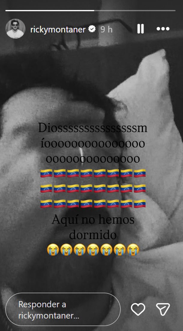 Ricky Montaner: el hijo de Ricardo Montaner, nacido en Caracas - donde fue el ataque de Estados Unidos - manifestó su emoción y apoyo a Venezuela tras la captura de Maduro. En sus historias publicó: "Dios mío, aquí no hemos dormido" junto a varias banderas de su país.
