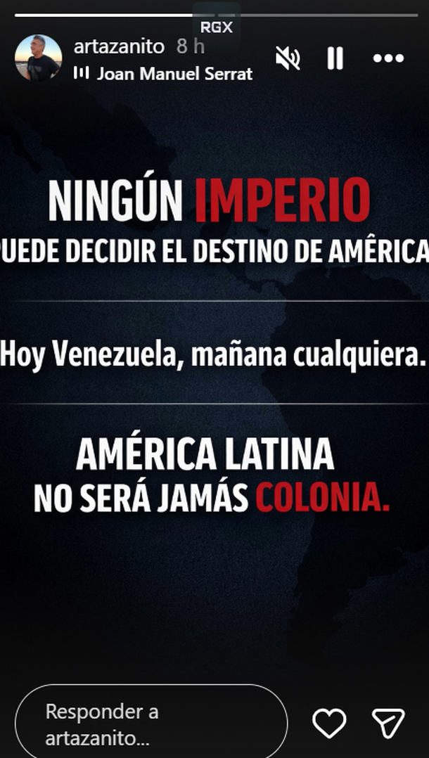 Nito Artaza: en sus redes sociales oficiales, escribió: "Ningún imperio puede decidir el destino de América. Hoy Venezuela, mañana cualquiera. América Latina no será jamás colonia”.