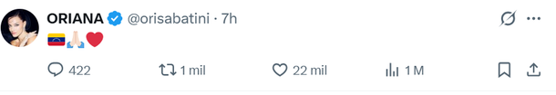 Oriana Sabatini: la hija de Catherine Fulop no solamente reposteó todo lo que publicó su madre, sino que además a través de su cuenta de Instagram y de X compartió dos emojis apoyando a Venezuela en conjunto con la bandera del país. Además, mostró su apoyo a Corina Machado reposteando sus comunicados.