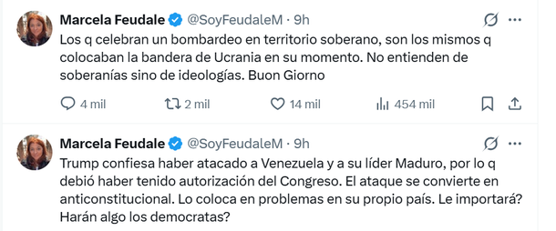 Marcela Feudale: la periodista fue una de las que se sumó al repudio de esta situación: " Los que celebran un bombardeo en territorio soberano, son los mismos que colocaban la bandera de Ucrania en su momento. No entienden de soberanías sino de ideologías. Buon Giorno", comenzó y cerró: "Trump confiesa haber atacado a Venezuela y a su líder Maduro, por lo que debió haber tenido autorización del Congreso. El ataque se convierte en anticonstitucional. Lo coloca en problemas en su propio país. ¿Le importará? Harán algo los demócratas?"