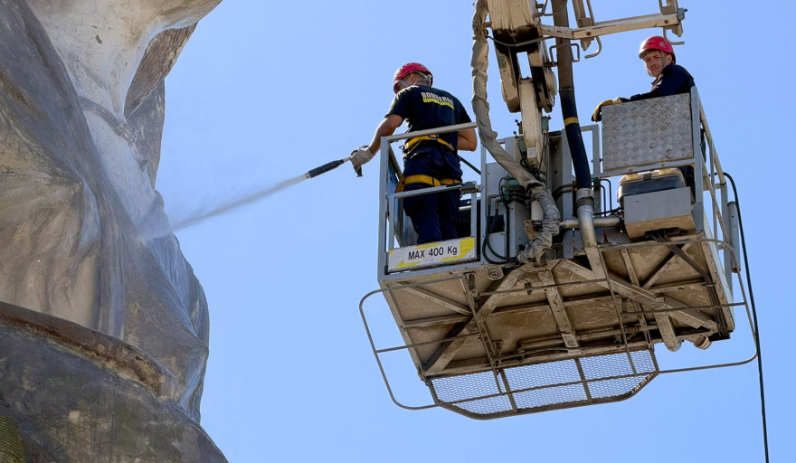 Los trabajos se desarrollan de manera articulada con los cuerpos de Bomberos de Necochea y Quequén, quienes colaboran en las tareas de hidrolavado de esta emblemática estructura, considerada una de las más imponentes del país en homenaje a la causa Malvinas.